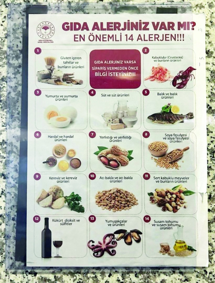 Meclis personelinin yemek yediği lokantanın girişinde, Tarım ve Orman Bakanlığı Gıda ve Kontrol Genel Müdürlüğü’ne ait bir broşür dikkat çekiyor. Bu broşürde gıda alerjilerine neden olabilecek besin maddeleri hakkında bilgi veriliyor. Sol alt köşedeki “kükürt dioksit ve sülfitler” ifadesi ile birlikte bir şişe ve kadeh dikkat çekiyor. Bu maddeler, şarapta koruyucu madde olarak kullanılıyor.