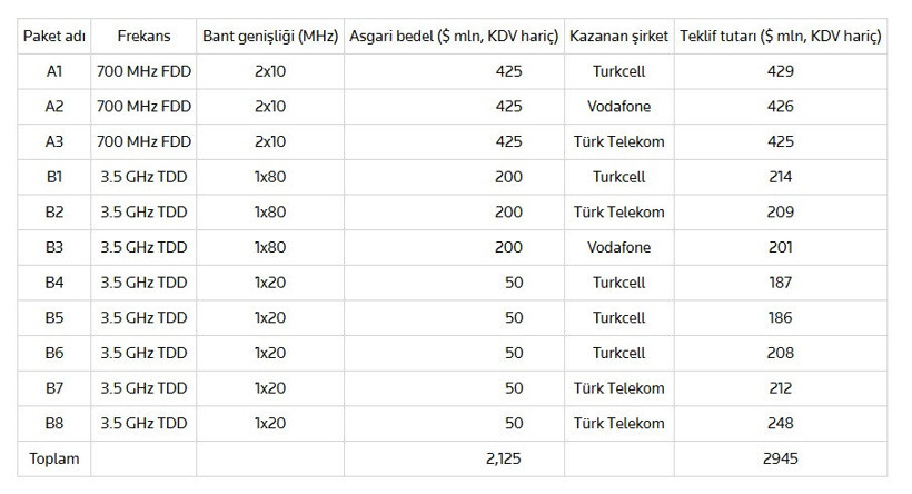 Turkcell, B1 paketini 214 milyon dolarla, Türk Telekom B2 paketini 209 milyon dolarla, Vodafone ise B3 paketini 201 milyon dolarla satın aldı.