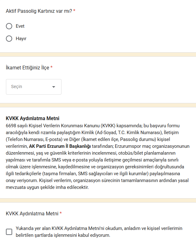 Burada mail adresi, TC kimlik numarası, cep telefonu gibi bilgilerin doldurulup Kişisel Verilerin Korunması Kanunu kapsamında verilerin kullanımına onay verilmesi talep ediliyor.