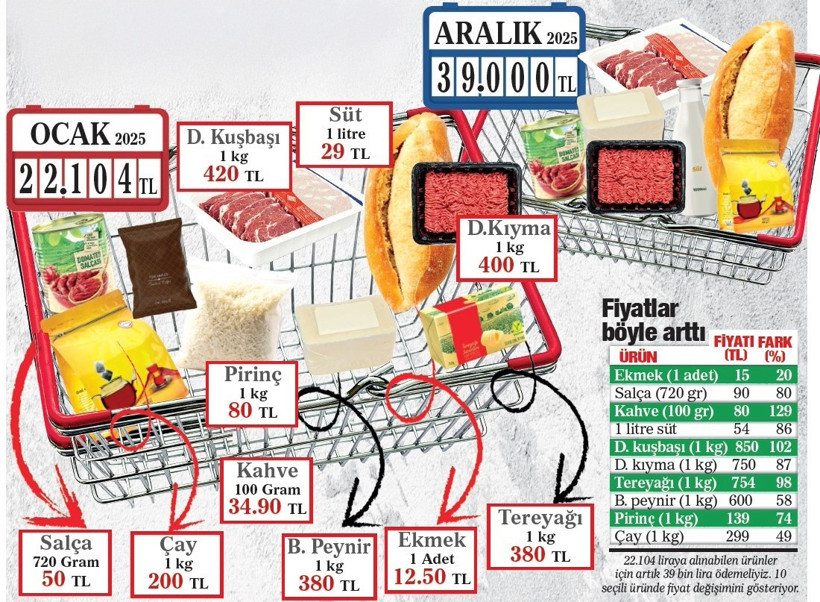Gürer’in hesaplamalarına göre, 10 temel üründen oluşan ve ocak ayında 22.794 liraya alınabilen ürünlerin bugün aynı miktarda yeniden alınabilmesi için 41.860 lira harcanması gerekiyor.
