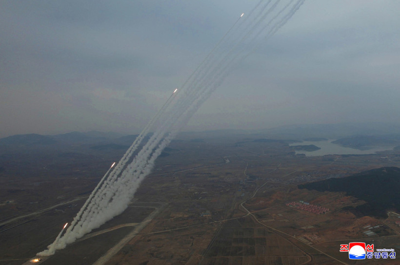 ABD ve Güney Kore'nin bu hafta Güney Kore'de askeri tatbikata başlamasının ardından Kim Jong-un, dün 12 adet 600 mm kalibreli çoklu roketatarın deneme atışını takip etti.