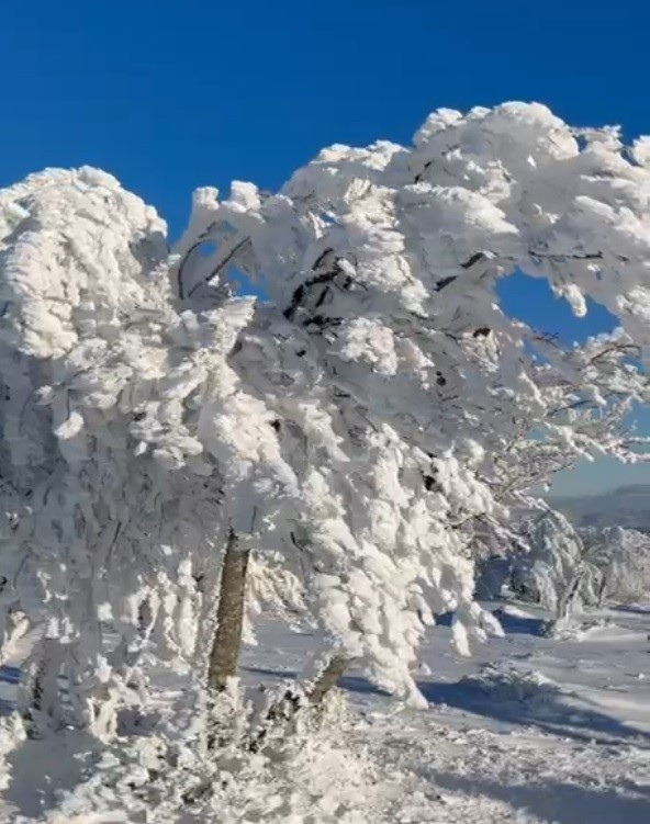 Zirveye tırmananların paylaştığı görüntülerde, ağaç dallarından sarkan buz sarkıtları ve tamamen karla kaplanmış zemin belirgin hale geldi. Buzla kaplanan doğal alan, Çataldağ'daki sert kış koşullarının etkisini gözler önüne seriyor.