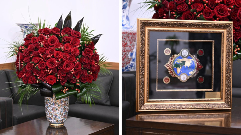 “Milliyetçi Hareket Partisi Genel Başkanı Sayın Devlet Bahçeli, Cumhurbaşkanımız Sayın Recep Tayyip Erdoğan beyefendinin 72. yaş gününü kutlayarak kendilerine 72 gül’den oluşan bir çiçek gönderdi. Ayrıca, İslam ülkelerine ait bir harita lazer gravür olarak hazırlanmış olup, üst kısmında Allah (C.C.) ismi, alt kısmında Hz. Muhammed (S.A.V.) ismi bulunmaktadır. Harita içerisinde Fetih Suresi’nin 1. ve 2. ayetleri yer almakta, köşelerinde dört halifeye ait isimler bulunmakta, Anadolu Türk desenleri lazer gravür ile işlenmiş ve zirkon taşlarla süslenmiştir. Bu tablo, kuyum işçiliği ile metal katmanlar halinde hazırlanmış, özel bir mine boyama yöntemi ile renklendirilmiş, sanatsal bir ahşap çerçeve içerisinde tek adet olarak sunulmuştur.”