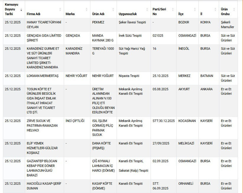 Konya'nın Bozkır ilçesinde faaliyet gösteren bir firmanın pekmezinde şeker bulundu. Ayrıca, Ankara'nın Akyurt ilçesinde 'yüzde 100 piliç eti' olduğu iddia edilen köftede mekanik ayrılmış kanatlı et tespit edildi.