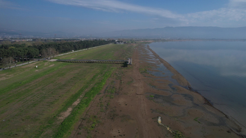 İznik Gölü'nde su yaklaşık 300 metre çekildi. Daha önce teknelerin yanaştığı iskele bölgesinde artık yürünebildiği görülürken, göldeki ciddi su kaybı dron ile görüntülendi.