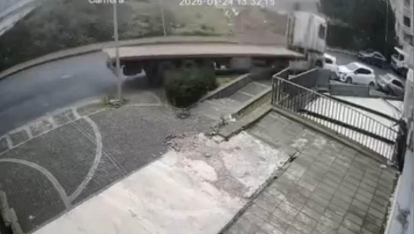 Bir sitenin güvenlik kameralarına yansıyan görüntülerde, TIR'ın kayarak önce kaldırıma, ardından da park halindeki araçlara çarptığı anlar görüntüleniyor.