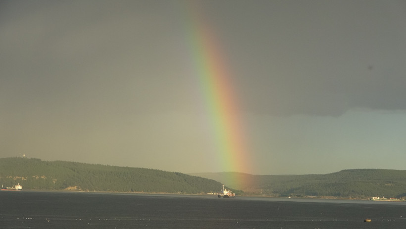 Günün ilk ışıklarıyla birlikte Çanakkale Boğazı'nda beliren çifte gökkuşağı, boğaz üzerinde oluşan renk cümbüşüyle vatandaşlara görsel bir şölen sundu.