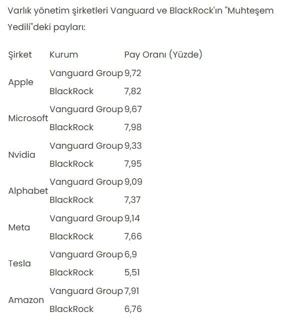 Amazon’da şirketin kurucusu Jeff Bezos, Tesla’da ise Üst Yönetici Elon Musk en büyük hissedar olarak öne çıkıyor. Yapılan hesaplamalar, BlackRock ve Vanguard’ın endeks fonları ve portföyleri aracılığıyla “Muhteşem Yedili”ye dahil şirketlerin toplamda yaklaşık %20’sini portföylerinde bulundurduğunu gösteriyor. Bu durum, dolaylı bir sahiplik yapısını ortaya koyuyor.