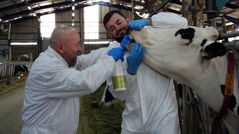 Burdur MAKÜ Veteriner Fakültesi'nden Prof. Dr. Mehmet Kale, araştırma görevlisi Yakup Sinan Orta ve uzman veteriner hekim İbrahim Oğuz Gayaker, büyükbaşların ağız lezyonları nedeniyle yem yiyememesi sorununa çözüm olarak, iştah artırıcı bir sprey tasarladı.