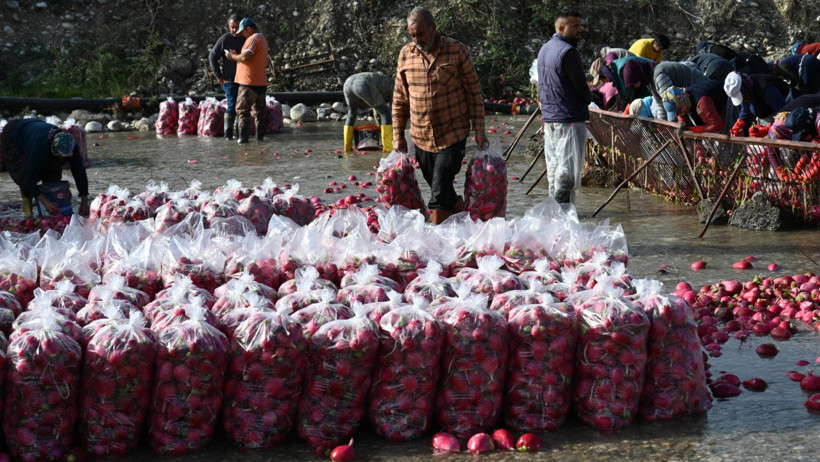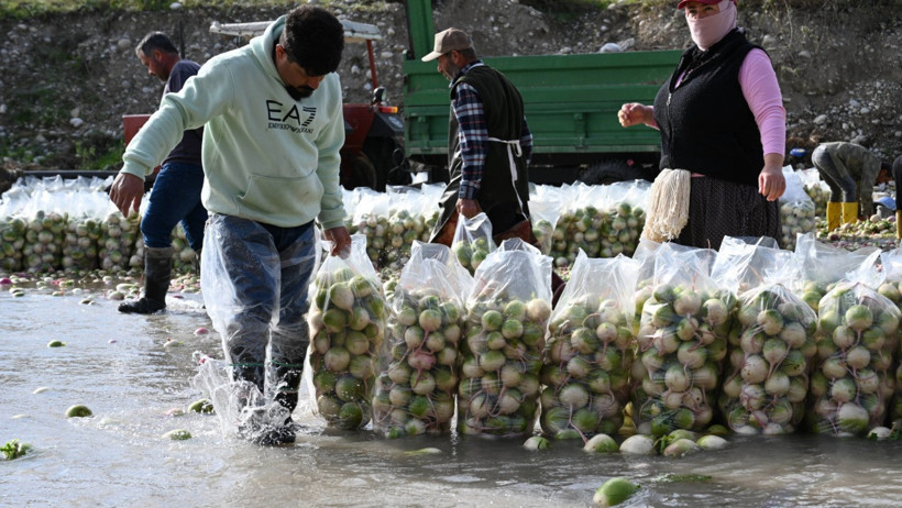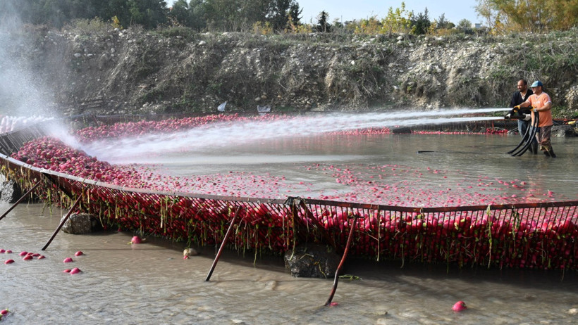 Osmaniye’de coğrafi işaret tescilli Kadirli turpunda hasada başlayan çiftçiler, tüketicilere ulaştıracakları ürünleri çamurdan arındırmak için Savrun Çayı’nın serin suyunda el birliğiyle çalışıyor.