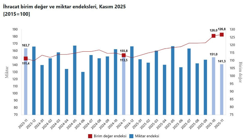 Kasım ayında ihracat birim değer endeksi, bir önceki yılın aynı dönemine göre yüzde 11,7 oranında artış gösterdi. Gıda, içecek ve tütün grubunda yüzde 9,5, ham maddelerde (yakıt hariç) yüzde 9,5, imalat sanayisinde ise (gıda, içecek, tütün hariç) yüzde 13,2 artış sağlandı. Ancak yakıtlarda yüzde 4,2 oranında bir azalma gerçekleşti.