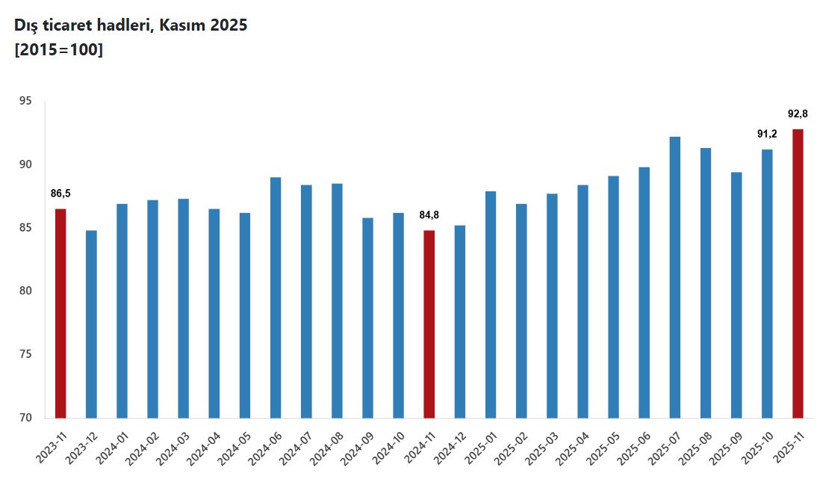 İhracat birim değer endeksinin ithalat birim değer endeksine bölünmesiyle hesaplanan dış ticaret haddi, 2024 Kasım ayında 84,8 iken, 2025 Kasım ayına gelindiğinde 8,0 puan artarak 92,8 seviyesine yükseldi. Bu rakam, Şubat 2021 sonrası için yaklaşık beş yılın en yüksek değeri olarak kaydedildi.