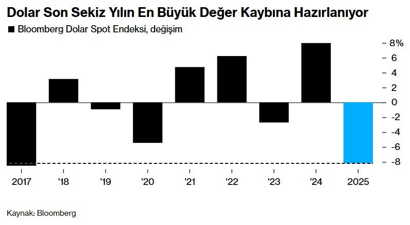 Bloomberg'in spot dolar endeksi, yıl başından bu yana %8,1 azalma gösterdi. Euro/dolar paritesi ise %13,4 oranında yükseldi. Nisan ayında, Donald Trump’ın “Kurtuluş Günü” olarak nitelendirdiği gümrük tarifeleri sonrası dolar ciddi bir düşüş yaşadı ve ABD Başkanı’nın gelecek yıl daha güvercin bir Fed başkanı atama yönündeki baskıları, kalıcı bir zayıflık dönemini başlattı.