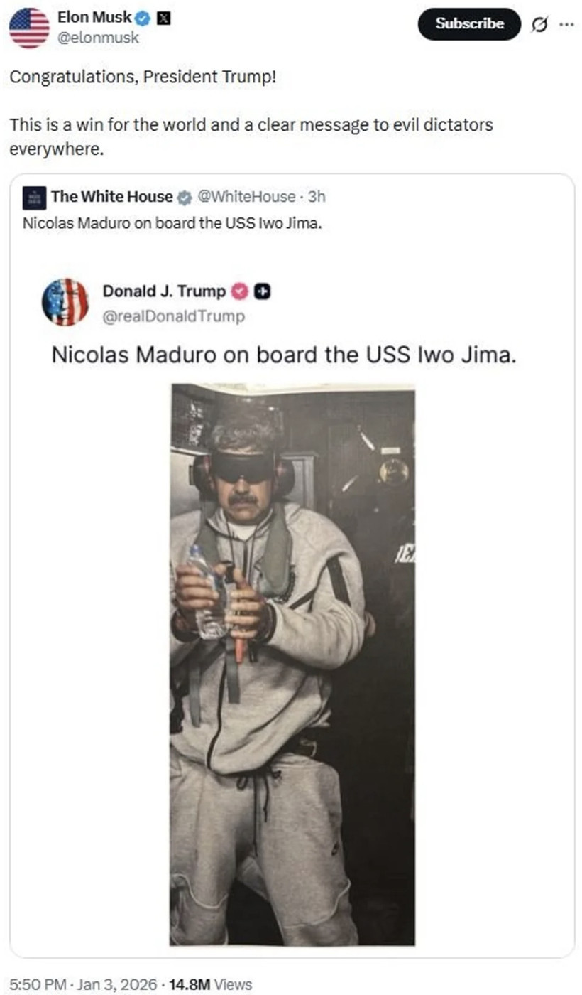 Uluslararası kamuoyunun gündeminde, ABD'nin Venezuela'ya yönelik gerçekleştirdiği saldırıda Venezuela lideri Nicolas Maduro ve eşinin yakalanması yer alırken, dünyanın en zengin adamından dikkat çekici bir açıklama geldi…