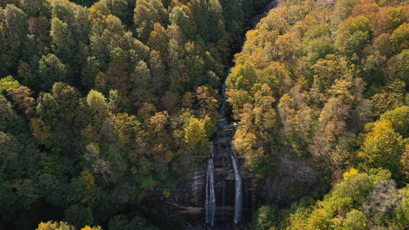 Sonbaharda yeşil ve sarı tonlarıyla ziyaretçilerini selamlayan şelale, dron ile havadan görüntülenmiş durumda.