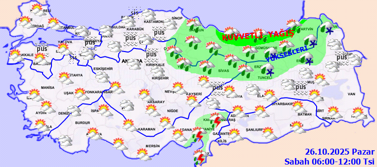 Meteoroloji Genel Müdürlüğü'nden alınan son tahminlere göre, ülkemizin genelinde hava durumu parçalı ve yer yer çok bulutlu olacak. Orta ve Doğu Karadeniz, Doğu Anadolu'nun kuzeyi, Osmaniye, Kahramanmaraş, Hatay, Sivas, Yozgat, Bingöl, Muş ve Van çevreleri yağmur ve sağanak yağışların etkisi altında kalacak. Ayrıca, Doğu Karadeniz'in iç kesimlerinin yüksek kesimlerinde karla karışık yağmur ve yer yer kar yağışı görülecek. Yağışların, özellikle Doğu Karadeniz kıyıları ile Ordu çevrelerinde kuvvetli olması bekleniyor.