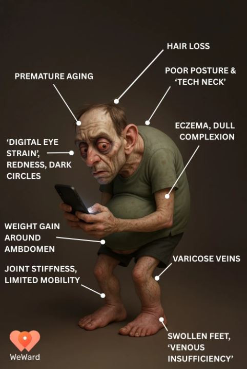 WeWard'un “Sam” modeli, hareketsizliğin insan vücudu üzerindeki etkilerini çarpıcı bir şekilde sergiliyor. Sürekli oturma durumu, vücuttaki yağın yakılmamasına ve karın çevresinde birikmesine yol açıyor. Bu da kalp hastalığı ve diyabet riskini artırıyor.
