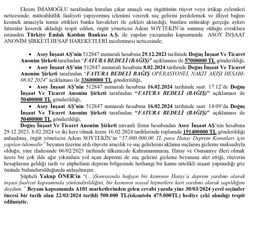 Soruşturma kapsamında, örgüt yöneticisi olduğu belirtilen Adem Soytekin'in Asoy İnşaat adlı şirketinin hesap hareketlerinde Doğuş İnşaat ve Ticaret AŞ tarafından “fatura bedeli (bağış)” açıklamasıyla toplamda 191 milyon 400 bin TL'lik bir transfer gerçekleştirildiği belirlendi.