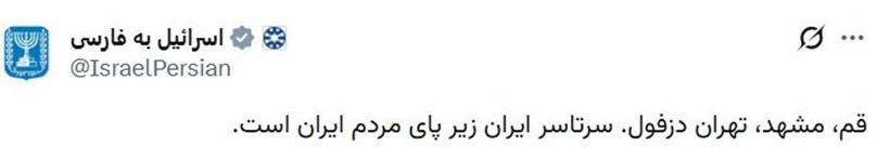 İran'da para biriminin tarihi bir çöküş yaşamasının ardından 28 Aralık'ta başlayan protestolara, İsrail'den dikkat çekici bir destek geldi. İsrail Dışişleri Bakanlığı'nın “IsraelPersian” adlı X hesabından yapılan Farsça paylaşımda, gösterilerin gerçekleştirildiği şehirler vurgulanarak, “Kum, Meşhed, Tahran, Dezful – İran’ın tamamı İran halkınındır” ifadelerine yer verildi.