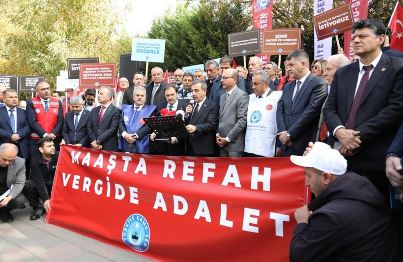 Türkiye Kamu-Sen üyeleri, memur ve emekli maaşlarına ek zam ve refah payı talebiyle TBMM önünde toplandı. Basın açıklamasını okuyan Konfederasyon Başkanı Önder Kahveci, memur ve emekli maaşlarına yapılan yüzde 11 artı 7 zammın, daha ilk aydan eridiğini vurguladı.