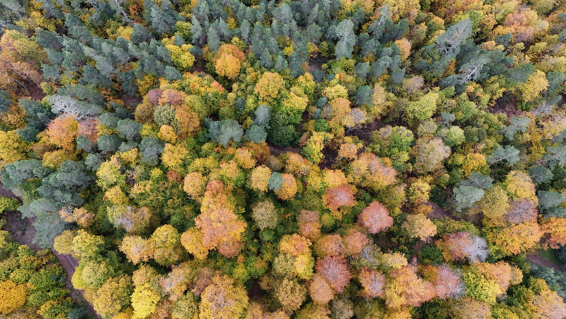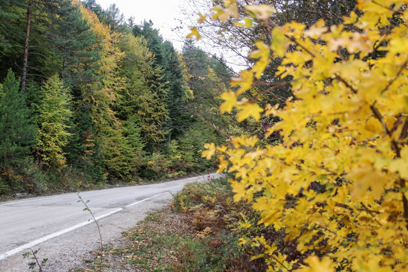 Karabük'ten Mengen istikametine uzanan yol boyunca sıralanan sık ormanlar, sonbaharın büyüsüyle kartpostal görüntüleri sunuyor. Havadan çekilen fotoğraflarda, ormanların sarı ve turuncunun pek çok tonuyla bezendiği, kıvrılan yollar ve zaman zaman sisle kaplı vadilerin yarattığı etkileyici manzara dikkatleri üzerine topluyor.