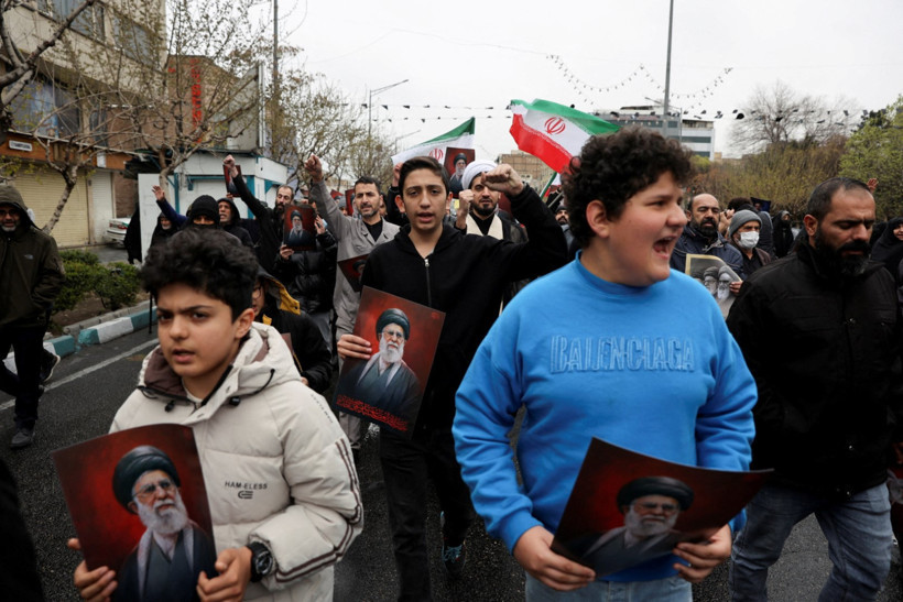 Tahran'daki Kudüs Günü'nde kalabalık ellerinde Ali Hamaney resimleriyle yürüyor.