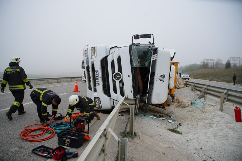 Edirne'de M.D. yönetimindeki 42 ABJ 033 plakalı kum yüklü hafriyat tırı, Edirne-Havsa yolunda sürücünün direksiyon hâkimiyetini kaybetmesi sonucu yan devrildi. Dorsede bulunan kum, yola savruldu. Kazanın, önünde arızalanan bir araca çarpmamak için yapılan ani manevranın ardından meydana geldiği öğrenildi.
