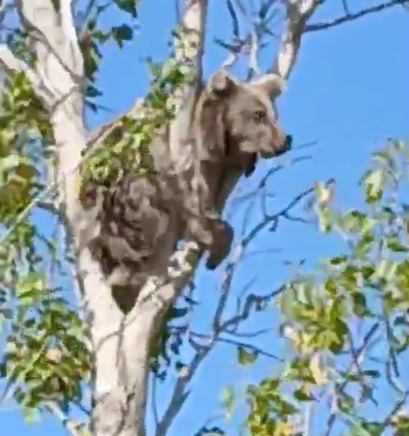 Bayburt'ta haftalardır gözlemlenen yavru ayı, bu kez köpeklerden kaçarken bir ağaca tırmandı.
