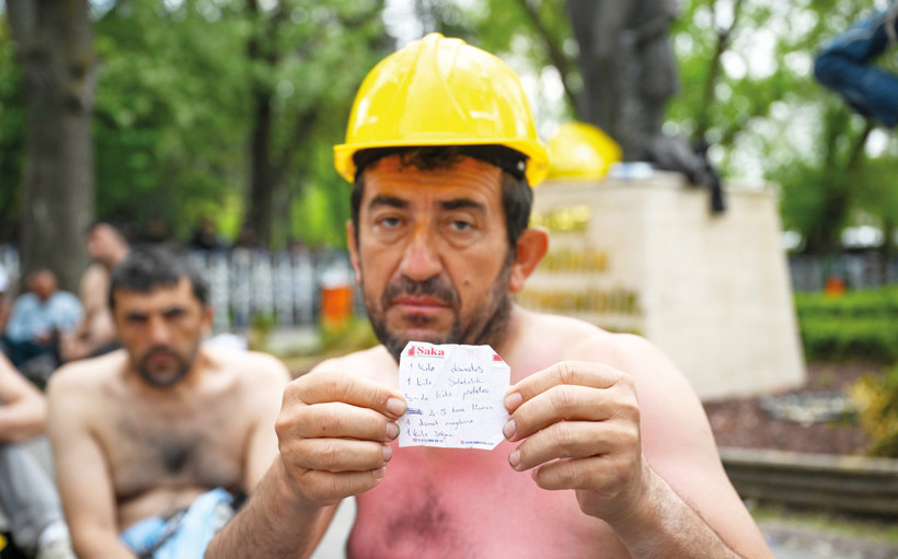 İŞÇİLER, patronların kendilerini soyduğunu sembolik olarak anlatmak için güneşin altında üstlerini çıkararak eylem yaptı. Kimi öfkeli kimi de açlıktan halsizdi. İşçilerin talepleri arasında madenlerin Tasarruf Sigorta Mevduat Fonu’na devrinden önce ve sonra çıkarılanların tazminatlarının verilmesi, sendika üyesi oldukları için atılanların işe iadesi, geçmişe dönük ücret ve sigortalarının yatırılması ve iş güvenliği sağlanması bulunuyor.