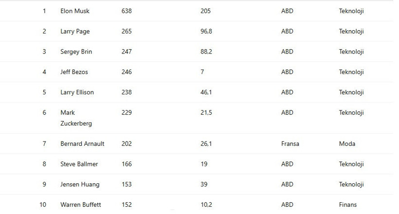 Dünyanın en zengin 10 iş insanının 9'unun Amerikalı olduğu görülürken, sadece 1 kişi Fransa menşeli. Ayrıca, bu kişilerin 8'inin teknoloji alanında faaliyet gösterdiği tespit edildi.