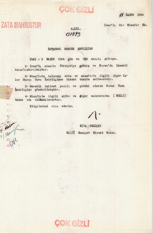 “İranlı misafir Türkiye'ye gelmiş ve Bursa'da ikameti kararlaştırılmıştır. Misafirin kalacağı evin ve misafirle ilgili diğer işler Bursa Yuva Amirliğince bizzat tanzim edilecektir. Gerekli talimat yazılı ve şifahi olarak Bursa Yuva Amirliği'ne gönderilmiştir. Misafirle ilgili şifre ve diğer muhaberatta 'belli' takma adı kullanılacaktır. Bilgilerini rica ederim.”