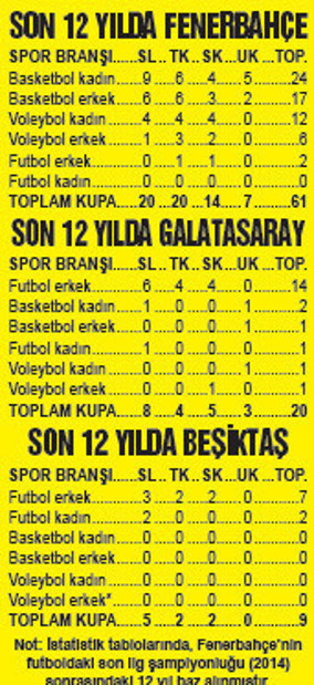 Futbolda her iki rakibinden geride kalan Sarı-Lacivertliler, basketbol ve voleybolda birlikte toplam 61 kupa kaldırdı. Galatasaray’ın futbol branşında kazandığı 20 kupanın 14’ü erkek futboldan gelirken, futbol dışı branşlarda zafer elde edemeyen Beşiktaş’ın toplamı ise 29’da kaldı.