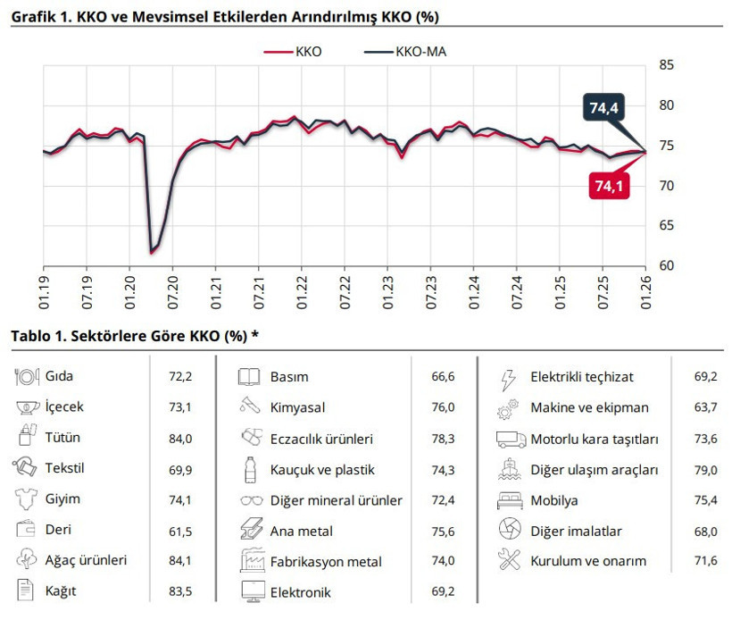Türkiye Merkez Bankası verilerine göre, 2026 yılı Ocak ayında imalat sanayi genelinde mevsimsel etkilerden arındırılmış Kapasite Kullanım Oranı (KKO-MA), bir önceki aya göre 0,2 puan artışla yüzde 74,4 seviyesine yükseldi.