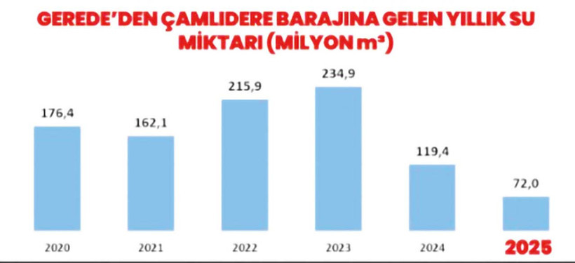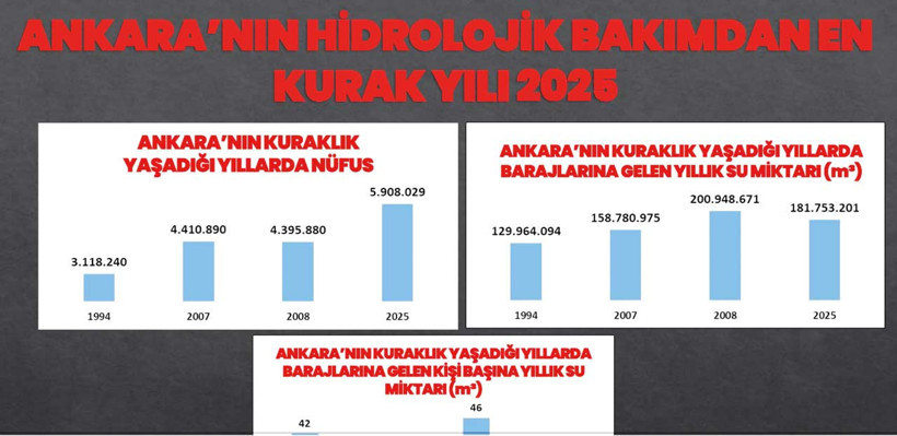 Yan taraftaki tabloya baktığınızda 1994-2025 arası sürede, Ankara’nın en kurak yılının 2025 olduğunu göreceksiniz. Ayrıca, başka bir tablo da 2020’den 2025 sonuna kadar Gerede’den Çamlıdere Barajı’na gelen yıllık su miktarının en düşük olduğu yılın yine “2025” olduğunu göstermekte.