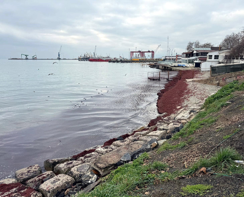 Tekirdağ'da etkili olan poyraz, Marmara kıyılarını kırmızı yosunlarla kapladı.