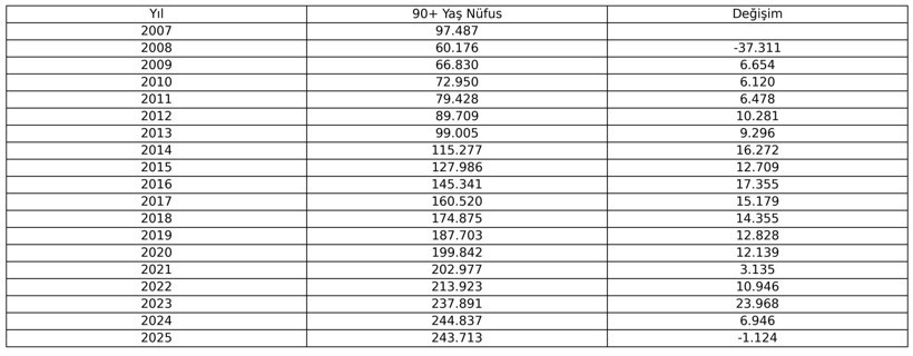 TÜİK verilerine göre 90 yaş üstü nüfus ve 2007-2025 yılları arasında yıllık bazda değişim grafiği şöyle: