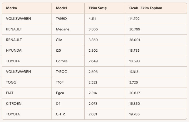 <p.Model bazında değerlendirildiğinde, Türkiye'de Ekim ayında en çok satan otomobil modeli Volkswagen Taigo oldu. 4.111 adetle zirvede yer alan Taigo'yu, 3.866 adetle Renault Megane Sedan ve 3.850 adetle Renault Clio takip etti.