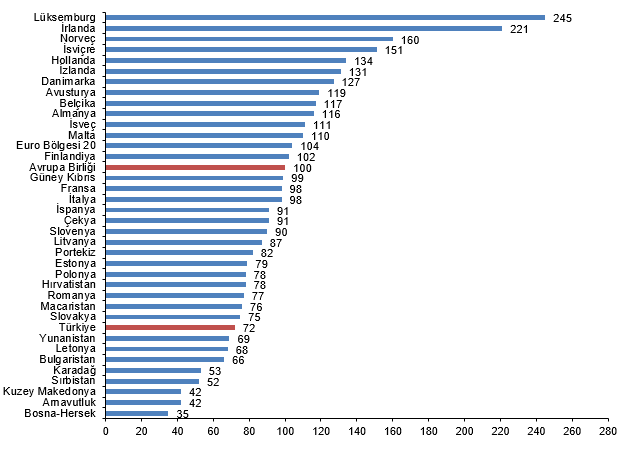 Avrupa Birliği İstatistik Ofisi (Eurostat) tarafından yayımlanan SGP verilerine göre, 27 Avrupa Birliği (AB) ülkesi için kişi başına GSYH endeks değeri ortalama 100 birimken Türkiye için bu değer 72 birim olarak saptandı; bu da AB ortalamasının yüzde 28 altında kalındığını gösteriyor.