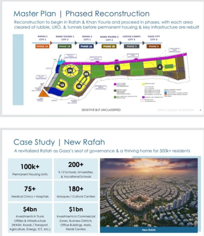 Yeniden inşa sürecinin, güneyde Refah ve Han Yunus'tan başlayarak kuzeyde Gazze kentine yönelmesi bekleniyor. “Yeni Refah” adıyla anılan bölümün Gazze'nin yönetim merkezi olacağı ve 500 binden fazla kişiyi barındıracağı planlanıyor.