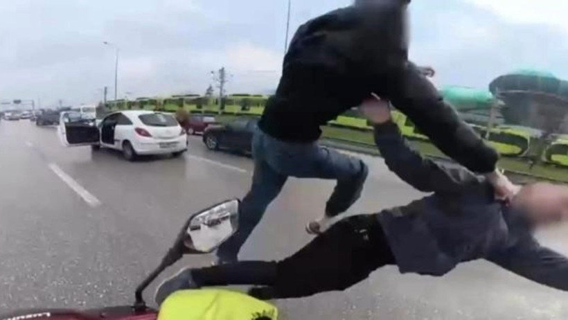 Bursa-İzmir güzergahında 'yol verme' meselesi nedeniyle iki sürücü arasında bir tartışma başladı. Araçlarını durduran taraflar, birbirlerine uçan tekme ile saldırarak kargaşa çıkardı. O anlar kameralara yansırken, çevredeki sürücüler ve yoldan geçen bir kurye durumu sakinleştirdi.