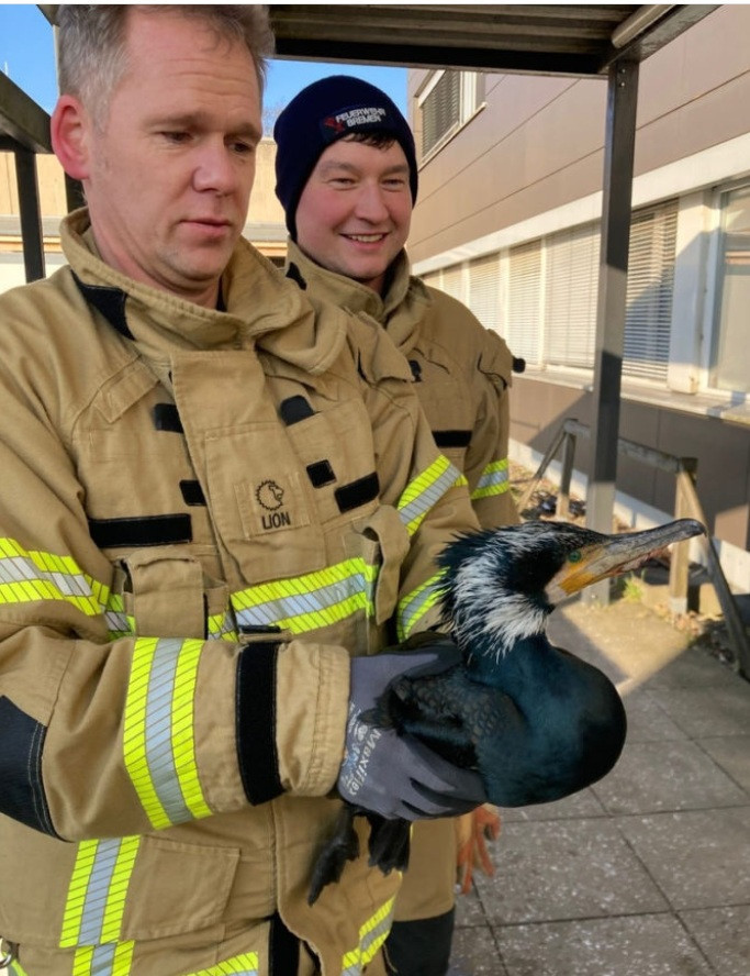Parlak siyah tüyleriyle dikkat çeken bu su kuşu, pazar günü Bremen'deki Klinikum Links der Weser hastanesinin cam kapısını gagasıyla vurdu. Kuşun gaga kısmında üçlü bir olta iğnesinin takıldığı gözlemlendi.