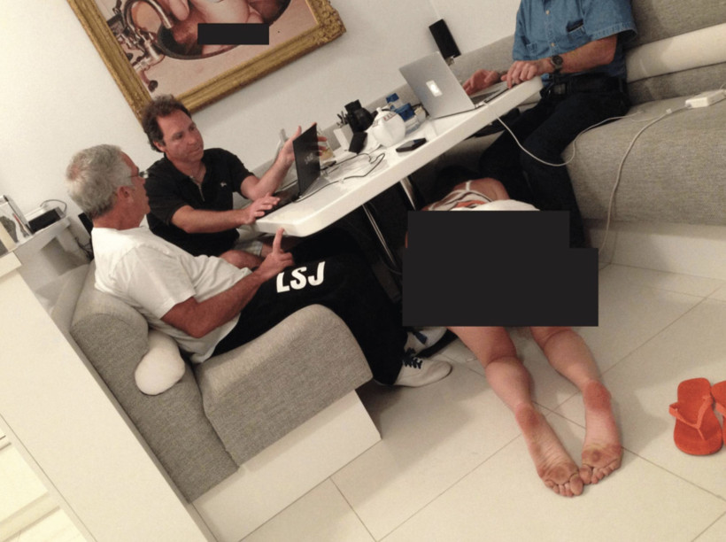 Yayımlanan görüntülerde Epstein’ın iki adamla birlikte bir masada çalıştığı görülüyor. Masanın altında ise bikinili ve çıplak ayaklı bir kadın yer alıyor.