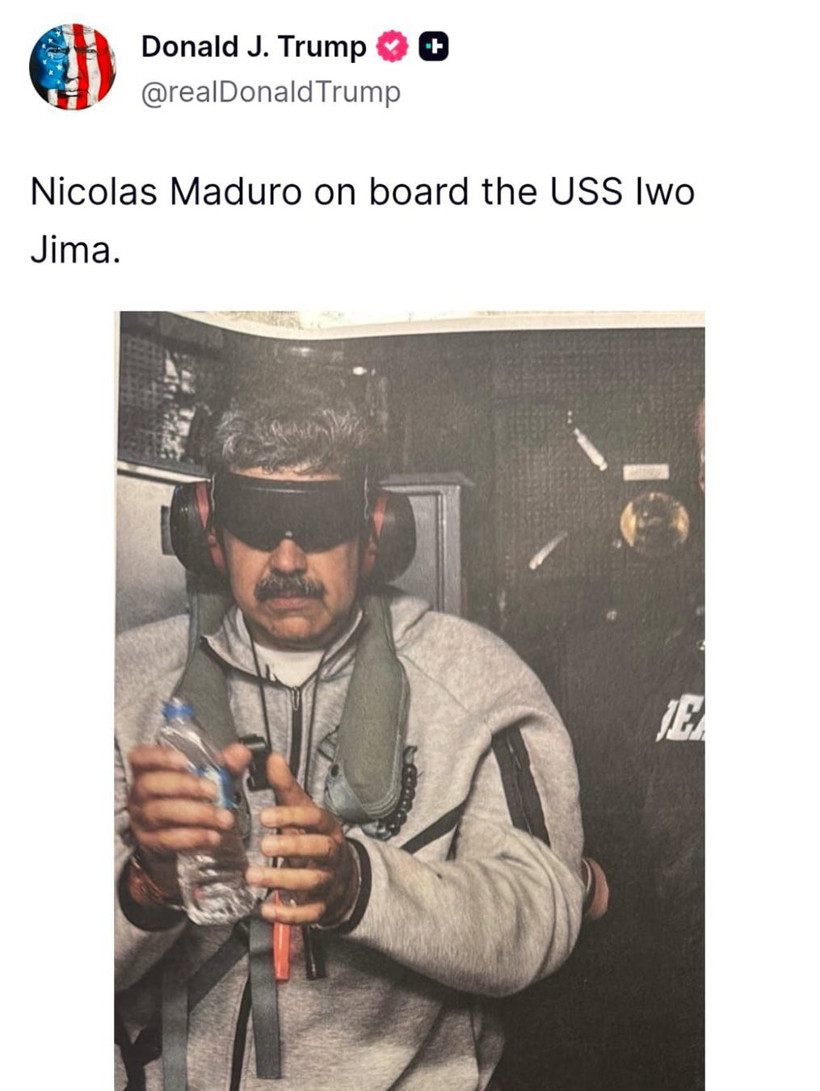 İkinci fotoğrafta ise Maduro'nun ellerinin kelepçeli ve gözlerinin bağlı olduğu görünmektedir. Bu görselin ABD Başkanı Donald Trump tarafından da paylaşıldığı ve USS Iwo Jima gemisinde çekildiği belirtiliyor.